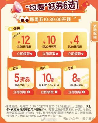 10:30,建行生活热门活动进去,约惠周五,好券6选1