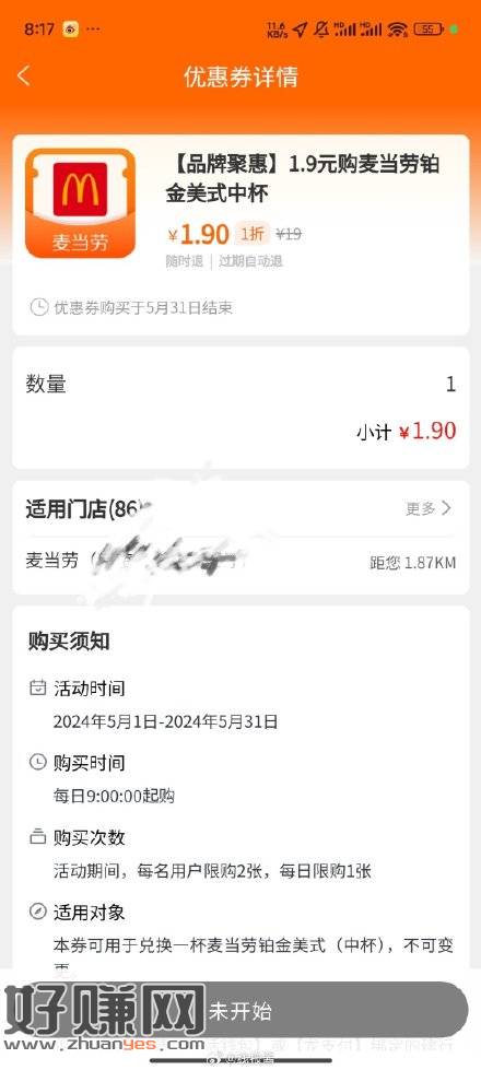 建行生活搜麦当劳,有一元甜筒,3.9麦旋风,1.9咖啡