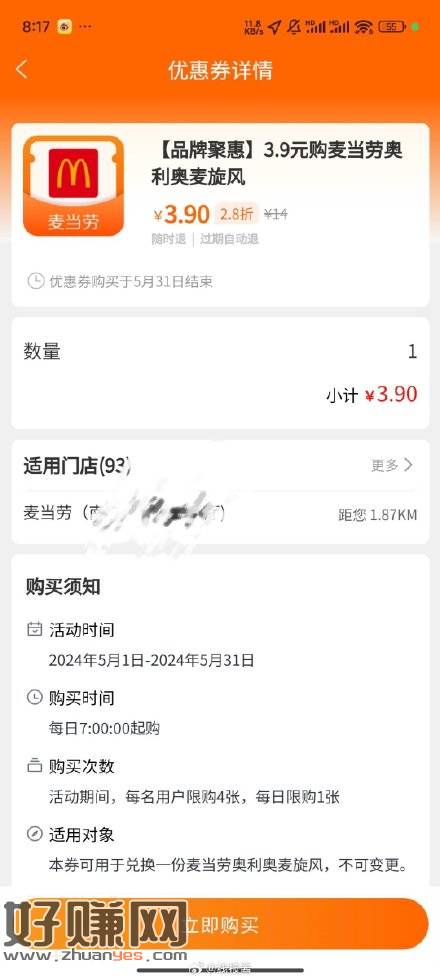 建行生活搜麦当劳,有一元甜筒,3.9麦旋风,1.9
