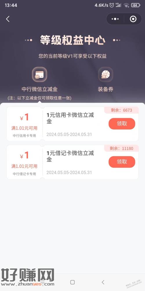 中行APP拉下-体育健身-能量驿站-跳转微信右上角‘等级权益’。。。也可以微信-能量驿站 那个小程序 进去领。