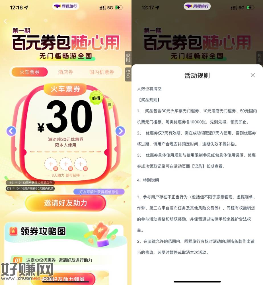同程3人助力领30元火车票券