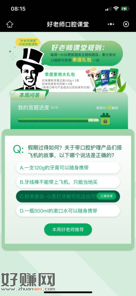 微信打开地址->每周1一道题目,连续答对15周领黑人牙膏礼包