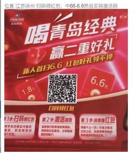 注意:一定要先扫江苏徐州青岛啤酒的活动码,扫出来激活红包以后再买瓶盖码激活提现