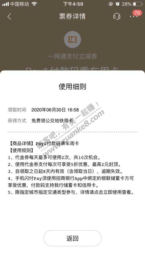 招商免费乘车周卡五折