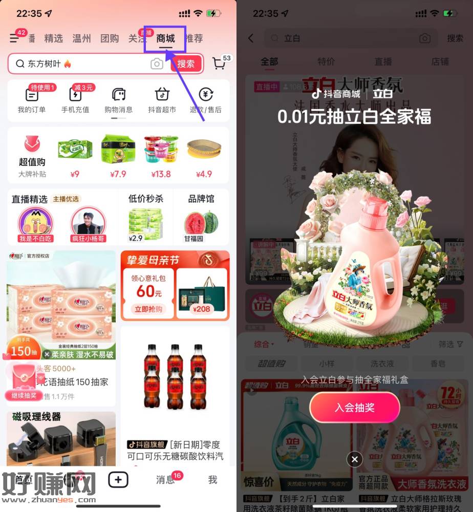 抖音APP顶部“商城”->搜索“立白”点弹窗抽0.01亓实物