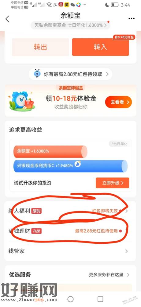 支付宝进入余额宝,看看有没有,活钱理财升级的2.88红包,有的还有个新人限时红包