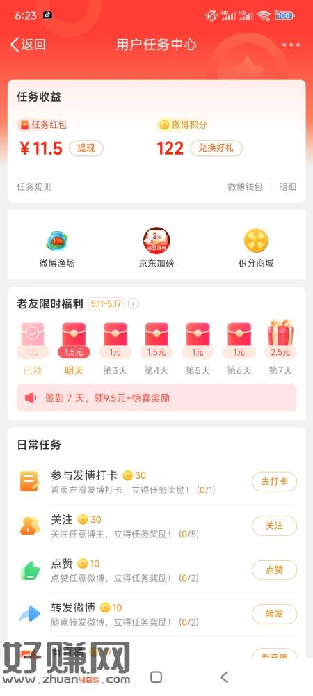 微博连续签到一星期领9.5可以连续签到两星期满20提现