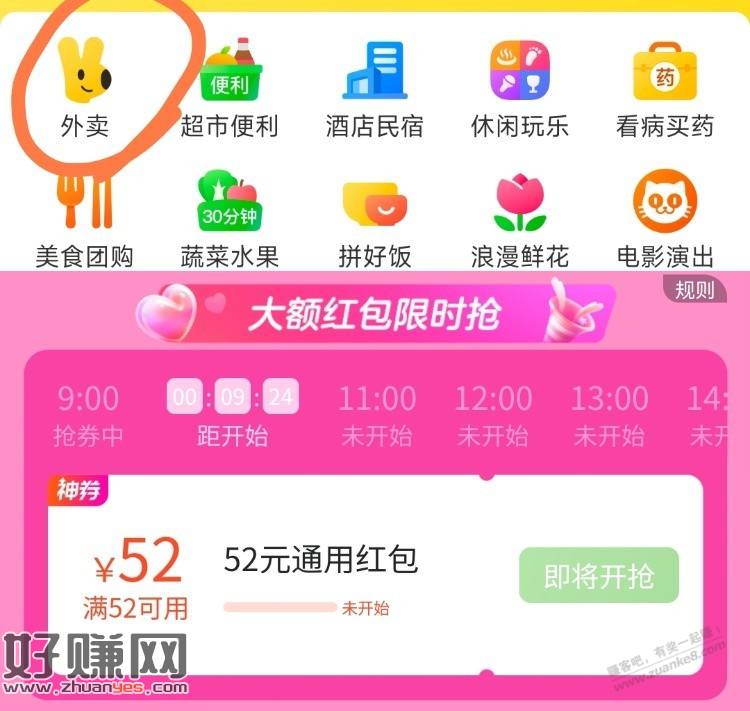 10点 美tuan-外 卖搜:母亲节 多个整点抢52红苞