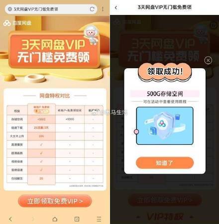 领取百度网盘500GB空间容量或3天vip 每个月都可以领!