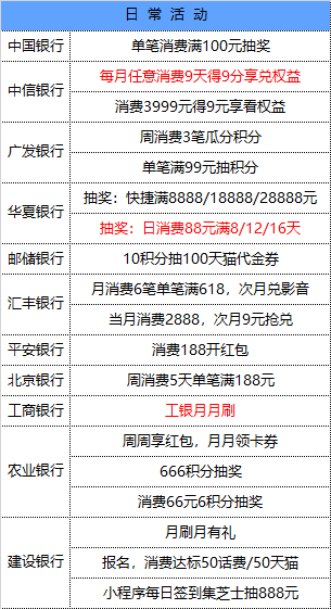 单笔消费满100元及以上即可获得红包一个,每月最多30个红包,红包100%中奖!红包奖品:18888积分、8888积分,888积分,188积分,88积分,美团、京东现金券。