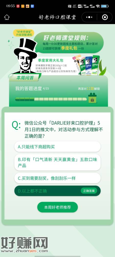 微信打开地址->每周1一道题目,连续答对15周领黑人牙膏礼包