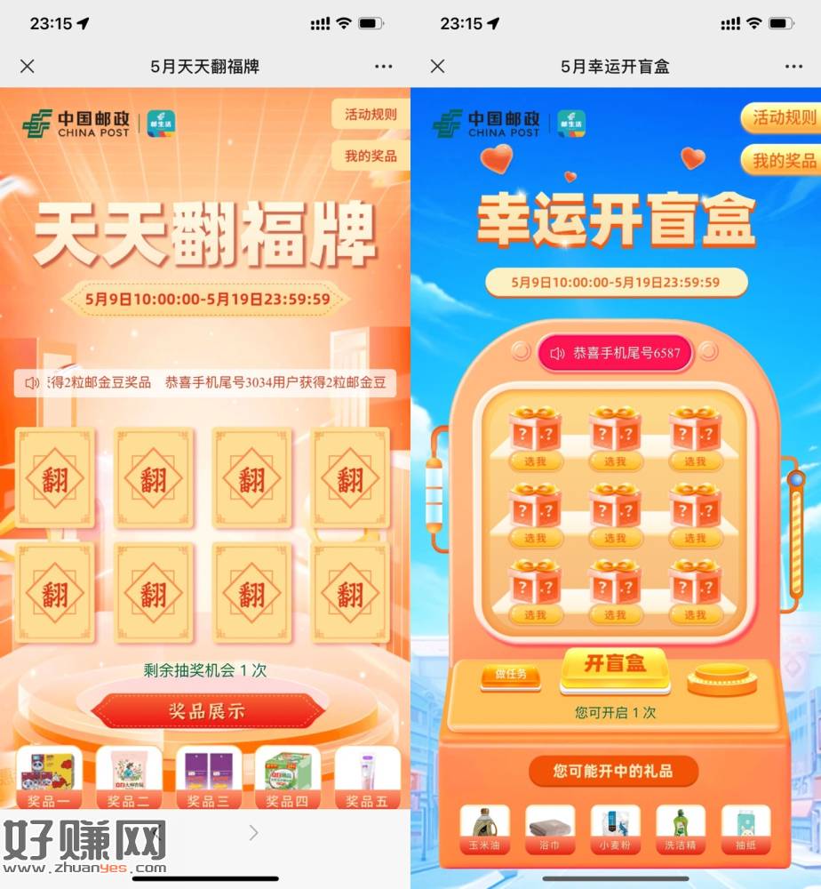 【邮生活5月天天翻福牌抽实物】微信打开地址->活动1每天1次机会,每天建议0点去抽->活动2默认只有1次机会,签到7天可再得1次机会