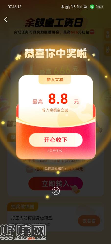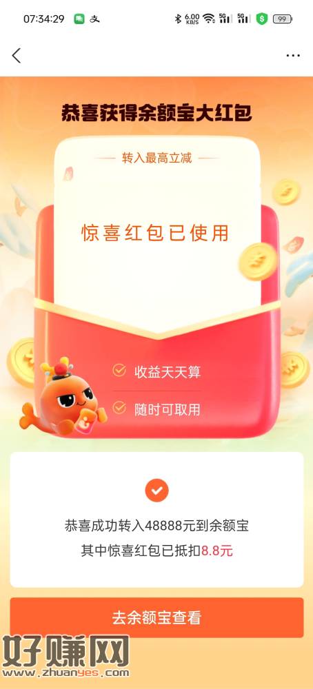 8.8毛 余额宝-工资日 弹窗领红包转入48888即可 然