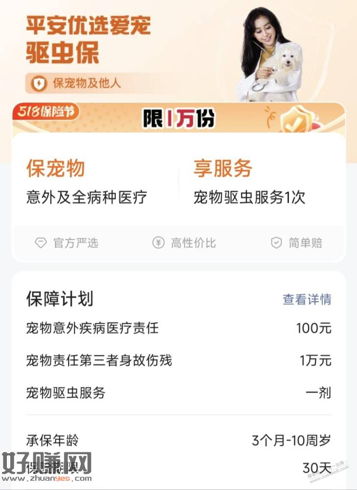 19.9送宠物内外同驱一次,宠物责任1万元赔付。猫猫狗狗都可以用,有效期30天,限量1w份 ,给毛孩子上份保障~有需求的上。用不上可以退保