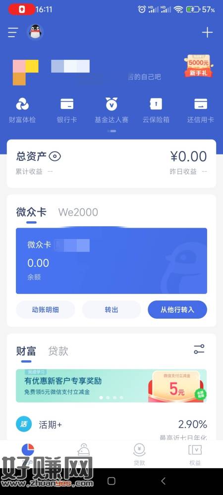 微众yin行,开微众咔,然后下面有个新客奖励,领5ljj