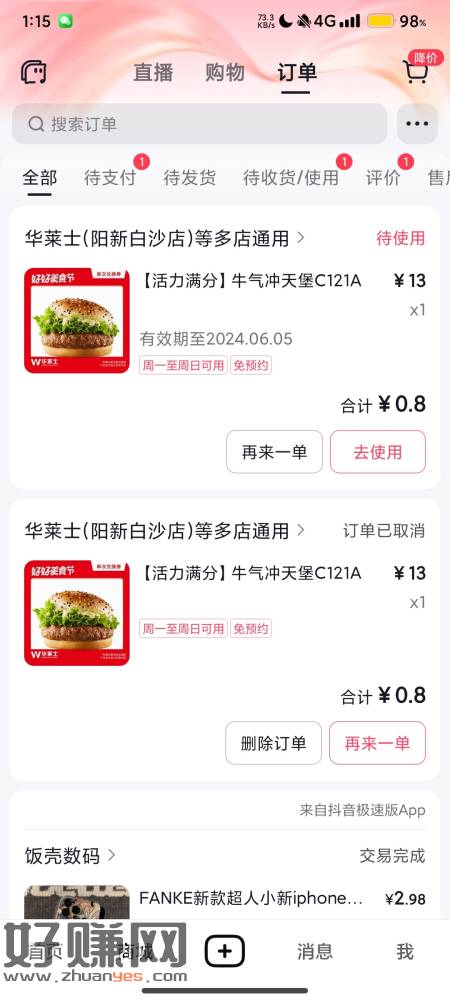 抖音很少买东西的账号或者很久没刷视频的账号0.8买一个汉堡 然后咸鱼5~6元可卖出
