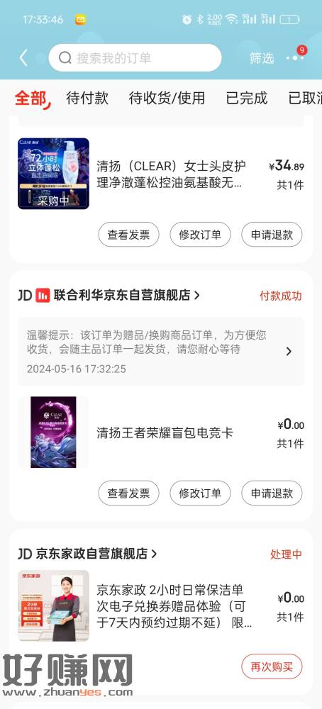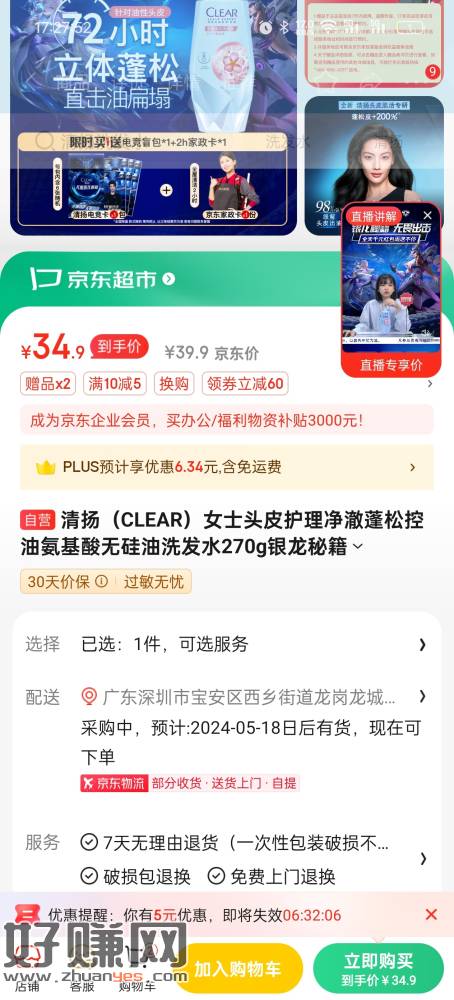 0撸清扬洗发水(女士) 入会送6-5(部分人还有张10-5可以下2单) 下单34.9送家政券找客服换成30豆子 京粉返5.24
