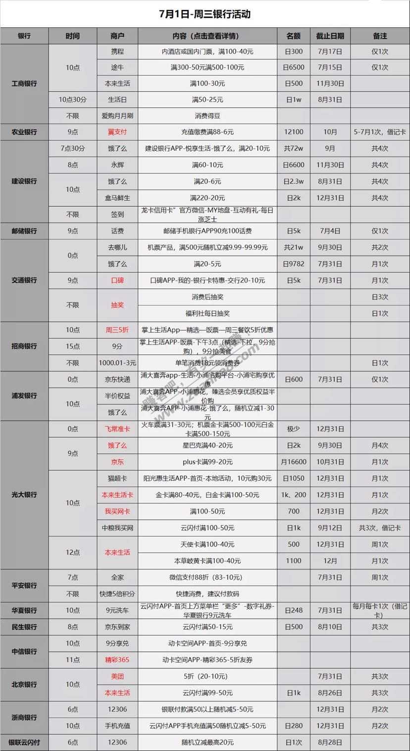 7.1号各大银行薅羊毛活动