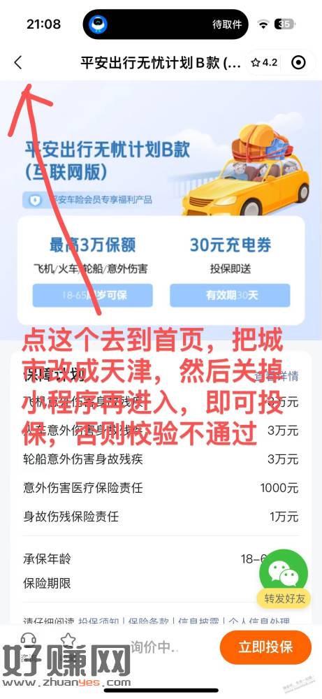 #小程序://平安好生活/qbCztvBXoLoKOlv , 打开后,点左上角的 < ,把城市改为天津,然后再进入这个小程序即可投保,否则校验不通过。投保完成后,登录平安好车主 app , 我的卡券里即可看到券,点去使用就可以了,有效期一个月,一人只能撸一次。