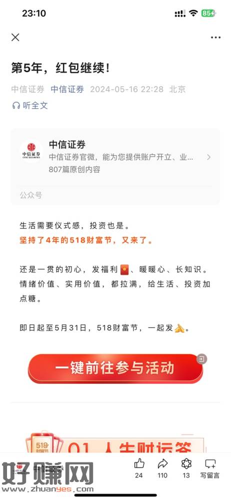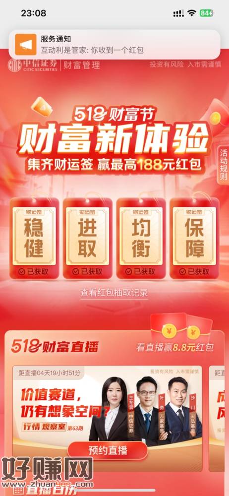 中信证券公众号最新推文,集齐四个财运签抽红包,几分钟就集齐了