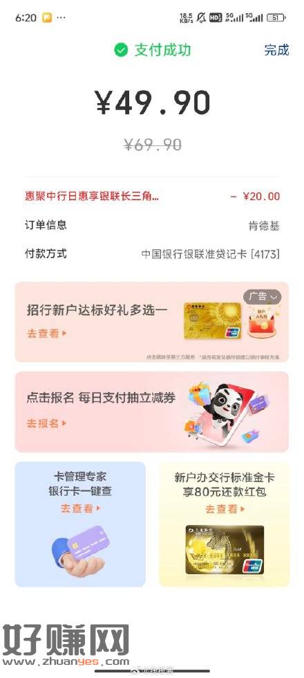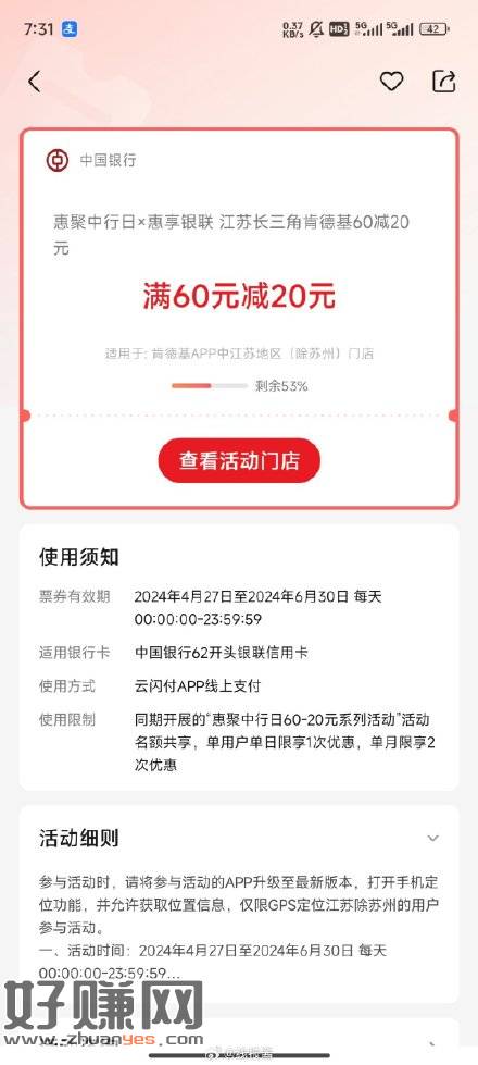 江苏地区,肯德基中行云闪付有69-20,可以买那个