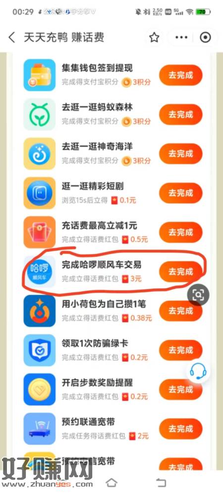 打开支付宝APP搜索【天天充鸭】进入小程序,下拉找到“哈啰顺风车交易”和“免费体验30天宠物险”两个任务0成本完成技巧:哈啰顺风车任务可以完成两次,点击去完成,随便选择自己附近一个目的地预约时间选择明天,然后支付费用,返回小程序获得3元话费红包,反复操作两次领取2张3元话费红包后,再去支付宝APP搜索【哈啰顺风车】进入2个订单修改订单-取消预约就行了30天宠物险任务,这个保险前30天是免费的,直接投保返回小程序获得2元红包再去支付宝搜索【蚂蚁保】-【我的保单】-点击宠物险-申请退保-取消预约退保话费红包都是发放到支付宝卡包里面,我们再去电信APP首页充话费可以自定义金额9元选择支付宝付款,支付前会显示立减