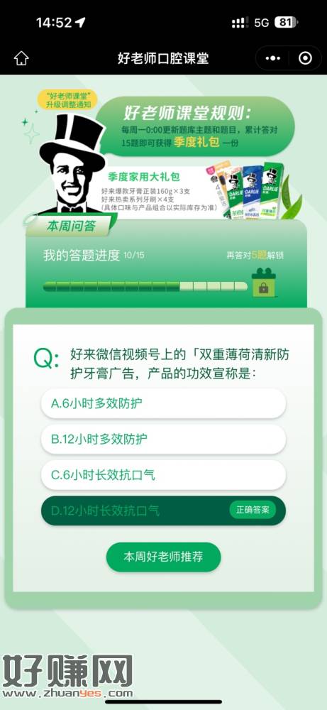 微信打开地址->每周1一道题目,连续答对15周领黑人牙膏礼包