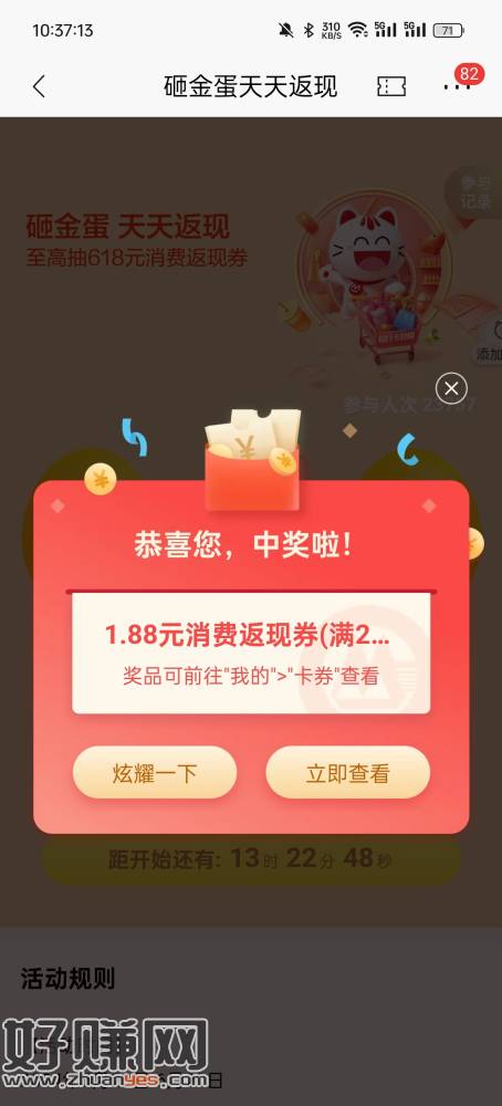 招行返现券 每天一抽 零钱通余额宝转账即可使用