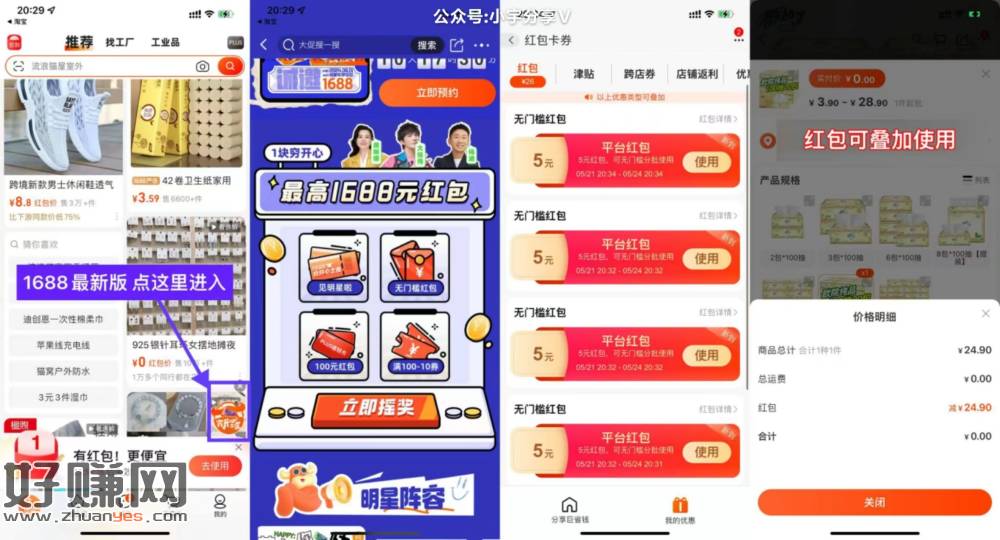 【阿里巴巴0亓撸20~25亓的实物】1688APP最新版->首页下拉一点右侧悬浮窗->默认有1次机会+4个好友助力得4次机会,每次抽基本必得5亓红包,所有红包可以叠加买自己想买的