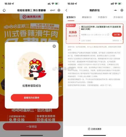 【海底捞领周三半份牛肉兑换券】微信打开地址->直接领取即可,限5月22日可用->刚好要吃海底捞的可以领下!