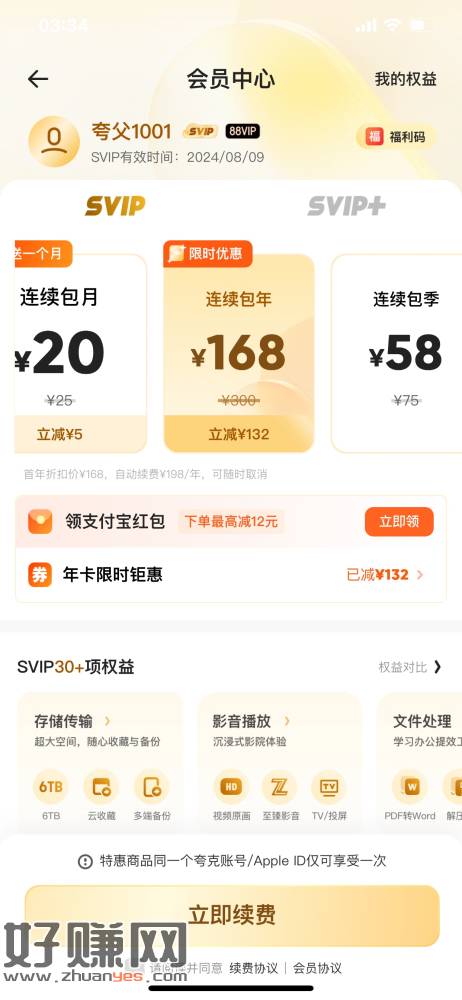 夸克会员中心跳转支付宝苹果商店6.1红包,自测