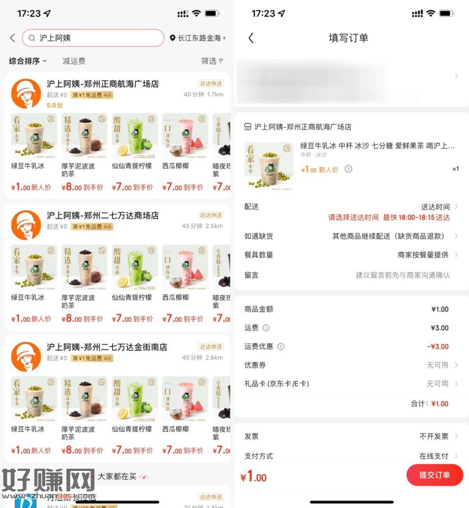 京东秒送1元撸沪上阿姨奶茶