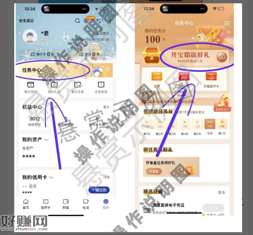 打开建设银行app-点击中心-点击开宝箱赢好礼-完成浏览累计1000积分(30秒完成)-抽奖得10元天猫超市卡