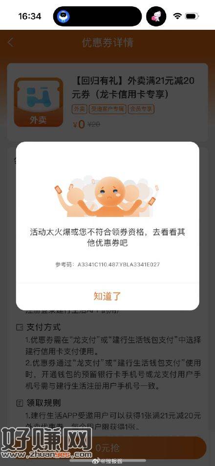 建行信用卡瘦腰有20外卖券