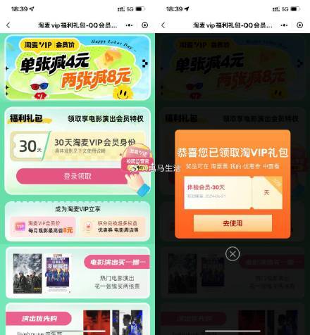 【淘票票免费领取30天淘麦会员】微信打开地址->直接领30天会员->买电影票能减几块钱