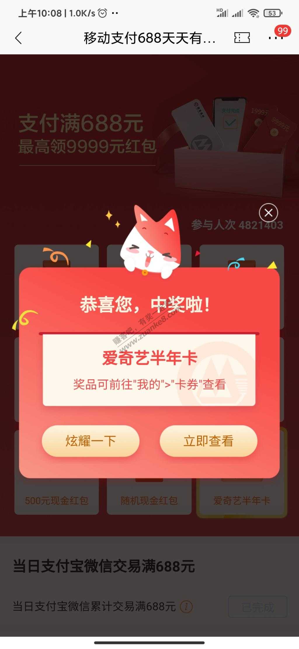 招行每日支付抽奖,微信转账688,然后直接抽奖,我两个号都中了爱奇艺半年卡!!!快上
