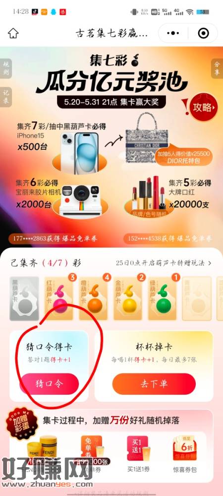 集7彩葫芦卡->每天输口令得葫芦卡+随机抽免单券、实物、买一送一券,集齐5~7彩必得图2的实物