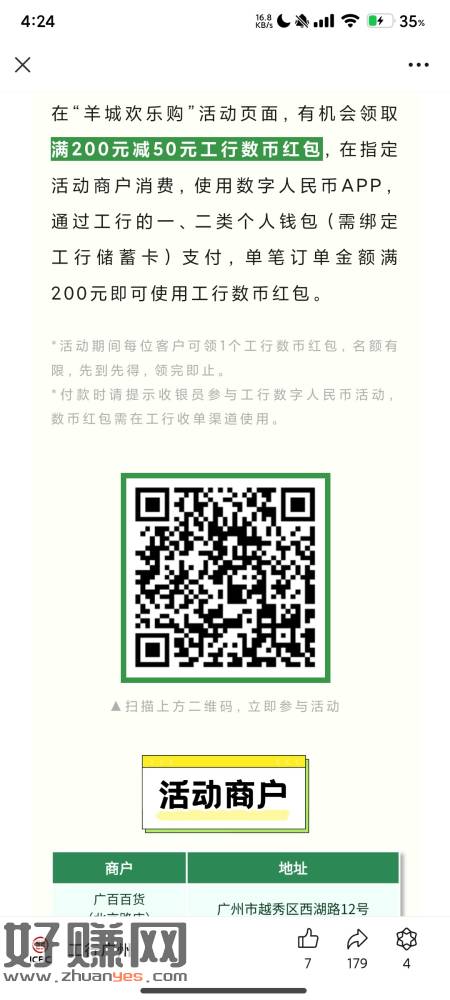 广州地区工行数字人民币个人钱包客户在“羊城欢乐购”活动页面,有机会领取满200元减50元工行数币红包,在指定活动商户消费,使用数字人民币APP,通过工行的一、二类个人钱包(需绑定工行储蓄卡)支付,单笔订单金额满200元即可使用工行数币红包。