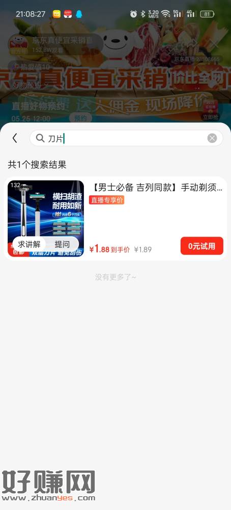 京东真便宜直播间 领了右上角红包 搜刀片 可以0撸剃须刀