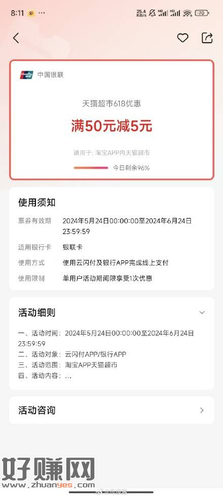截至6.24,天猫超市云闪付有50-5