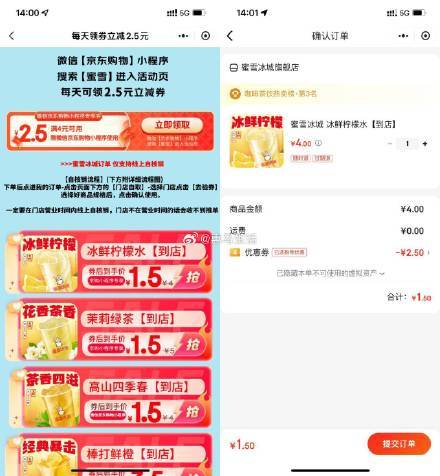【京东每天1.5亓买蜜雪冰城券】每天可领2.5亓券,1.5r买柠檬水/茉莉绿茶/四季春,记得要去京东购物小程序下单