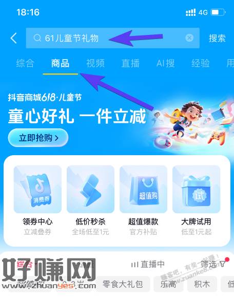 抖音app搜“61儿童节礼物”,点商品,再点横幅进去