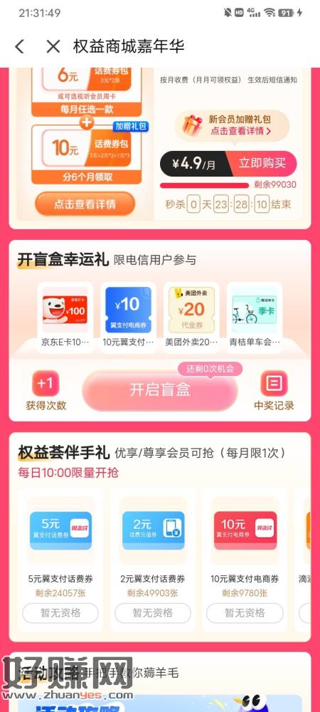 yzf电信,权益,权益商城,权益嘉年华,抽100