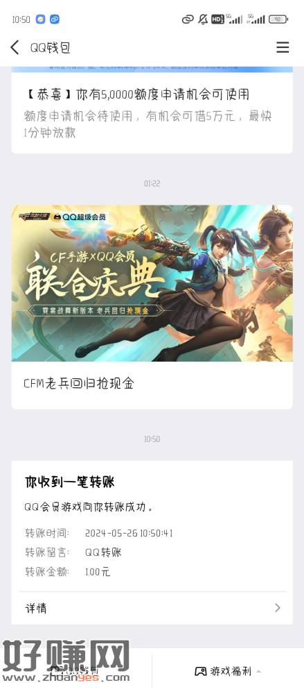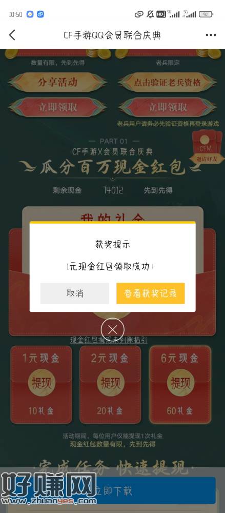 QQ CF领现金老用户的话,直接验证分享就能领取,