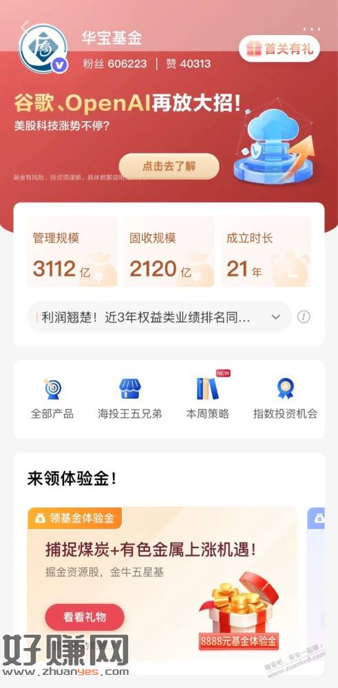 招商银行搜:华宝基金。3个8888体验金任选其一