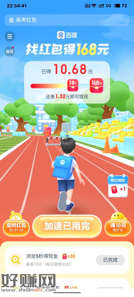 百度 搜 高考红包,任务做完差不多两天可以提现10,