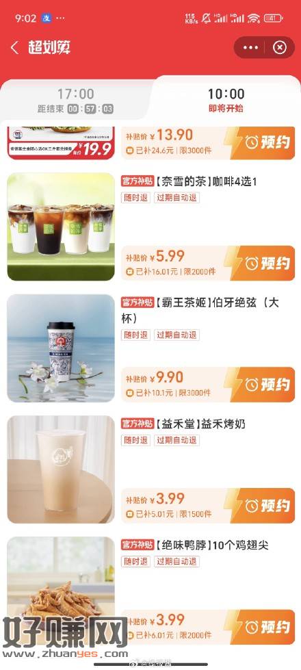 10点,支付宝消费圈,超划算大牌低价点进去,今天有霸王茶姬伯牙绝弦等