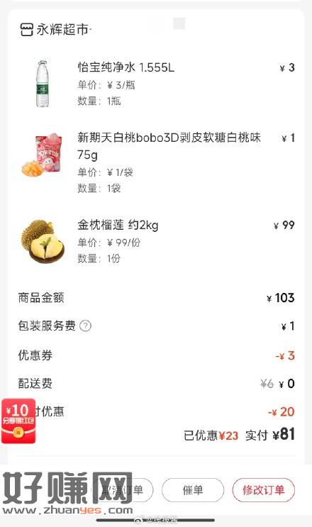 永辉生活App,榴莲2kg目前秒杀价99,可以叠叠加云闪付中行信用卡80-20,到手80左右