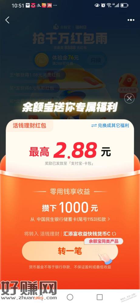 搜福利日,红包雨,弹2.88,可货币基金1000抵