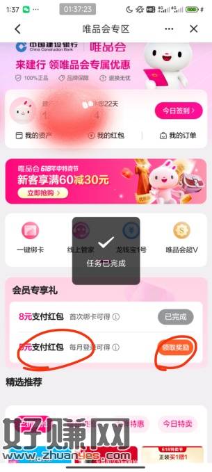 然后再去唯品会找到一个15块钱的商品 小程序领的10抵扣 然后支付的时候建行又抵扣5 就是实际支付0